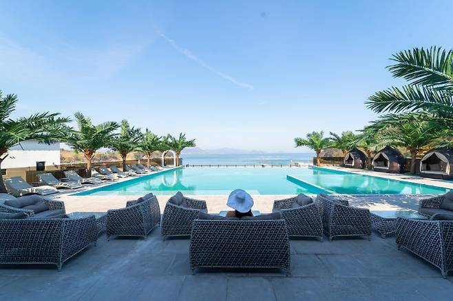 여수의 푸른 바다를 품은 블루망고 풀빌라앤리조트는 해외 휴양지에 온 듯한 감성을 선사하는 풀빌라인데요. 국내 최장 길이를 자랑하는 49m 인피니티풀이 상당히 매력적입니다. 2단 구조로 설계되어 있기 때문에 풀장에서 남해를 바라보며 수영하다 보면 마치 끝없이 이어지는 수평선 속으로 들어가는 듯한 기분도 들죠.