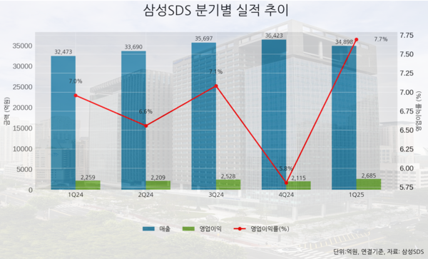 삼성SDS의 올 1분기 연결기준 전사 매출은 3조4898억원, 영업이익은 2685억원으로 전년동기 대비 각각 7.5%, 18.9% 늘었다. 같은 기간 영업이익률은 7.7%로 0.7%p 상승했다.