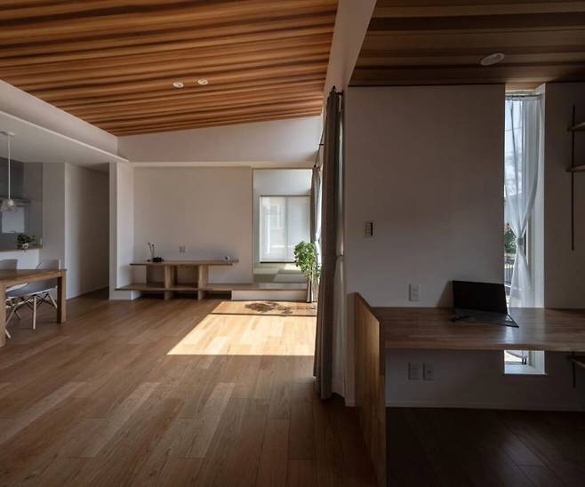 서쪽에서 동쪽으로 이어지는 이 집의 공간 구성은 아이방, 거실, 침실, 욕실 순으로, 보다 사적인 공간이 집의 깊숙한 곳에 자리하도록 설계되었습니다.