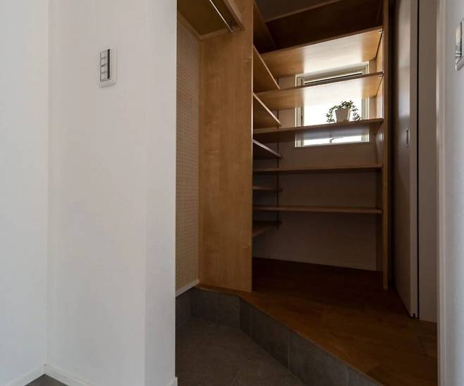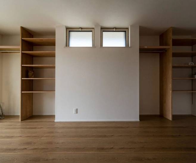 탈의실 맞은편에는 워크인 옷장이 위치해 있으며, 앞쪽에는 수납 선반이 있어 활용성을 높였습니다. 일본식 방에는 테라스로 향하는 미닫이창이 설치되어 있어 손님용 이불 등을 손쉽게 말릴 수 있습니다.