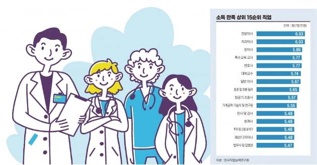 이렇다 보니 소득 수준이 높은 직업은 치과 의사·한의사·변호사·대학교수·전문 의사·일반 의사·항공기 조종사·증권 및 외환 딜러 등의 순이지만 종사자들의 소득 수준에 대한 만족도를 물어 보면 톱3가 전부 의사다. 전문 의사·치과 의사·한의사 순이다. 고소득으로 직업 선호도가 높은 편인 개발자는 톱15 순위에도 없다.