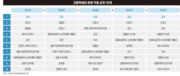 한순간도 톱10 지위를 잃지 않았던 직업 의사는 2018년과 2019년에 톱10에서 사라졌다. 하지만 2020년 의사가 다시 순위권에 들어섰다. 특히 2020년에는 의사, 간호사, 생명·자연과학자, 연구원의 순위가 전년보다 상승했다. 의사는 2019년 11위였던 희망 직업 순위가 5위로 껑충 뛰었다. 2022년 현재는 7위다. 교육부 관계자는 “코로나19 사태의 영향으로 보건·의료 분야에 대한 관심이 높아졌다”며 “뉴스에서 의사·간호사를 자주 접하고 백신 개발이 이슈가 되면서 생명·자연과학자에 대한 관심도 높았다”고 말했다.