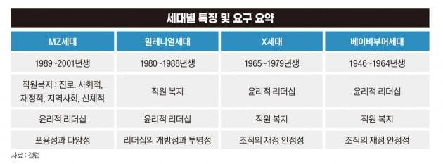 MZ세대의 퇴직률이 가팔라지고 있다는 점도 주목해야 할 부분이다. 변화를 앞당긴 것은 세대별 직업 인식의 차이에 있다. 갤럽이 조사한 바에 따르면 1946~1964년생인 베이비부머 세대는 직업을 선택할 때 윤리적 리더십, 직원 복지, 조직의 재정 안정성을 우선순위로 삼았다. 1965~1979년생인 엑스(X)세대도 동일하다. 베이비부머가 “철이 없다”고 혀를 찬 X세대도 윤리적 리더십, 직원 복지, 조직의 재정 안정성이 중요했다.
