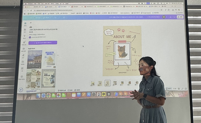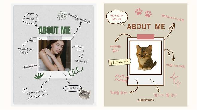 | ▲ 캔바 활용 예시 왼쪽이 유료버전 오른쪽은 유료버전을 따라 무료로만 만들어본 실습 결과물 |