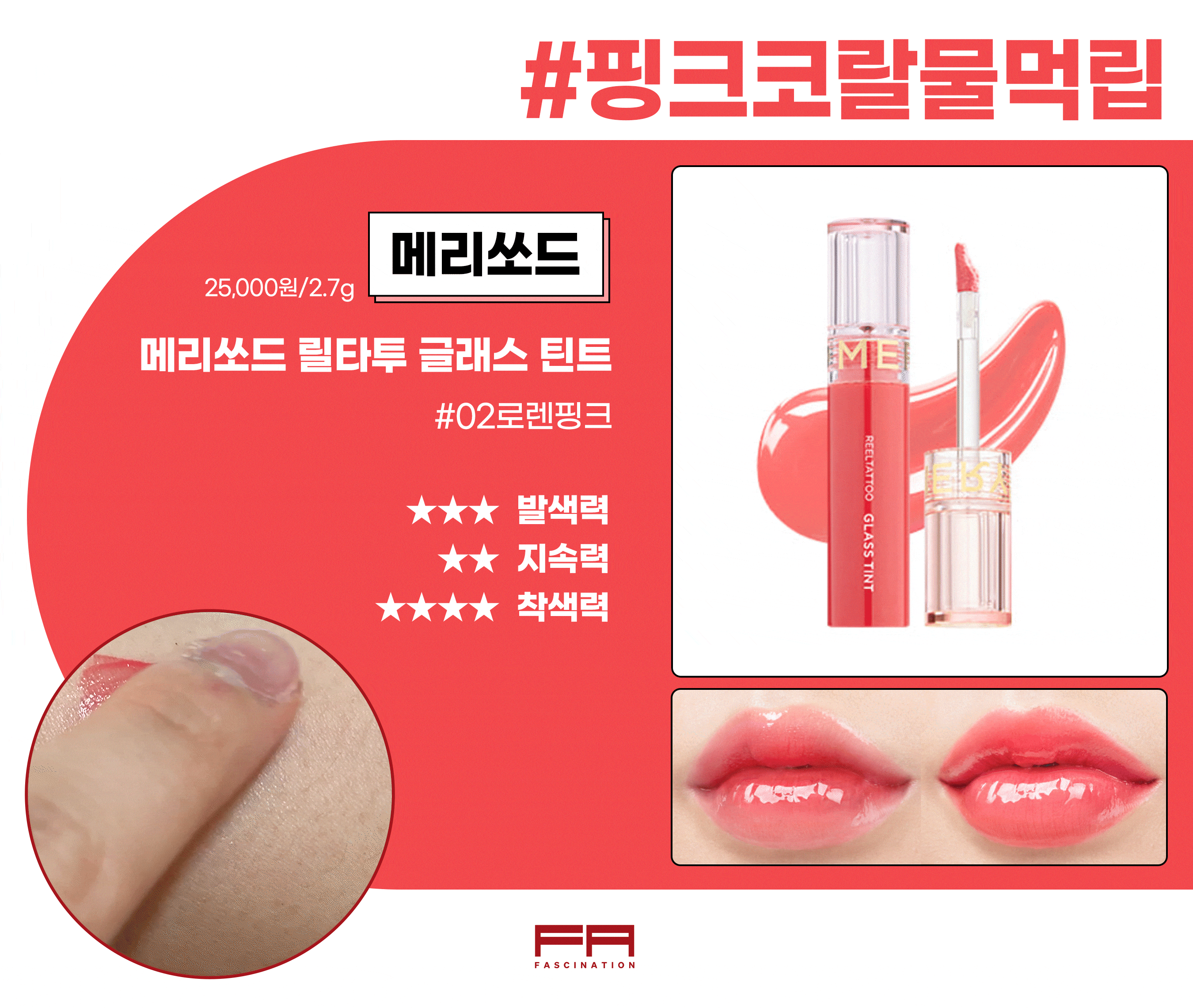 3. 메리쏘드 릴타투 글래스 틴트 02로렌핑크 / 2.7g / 25,000원
