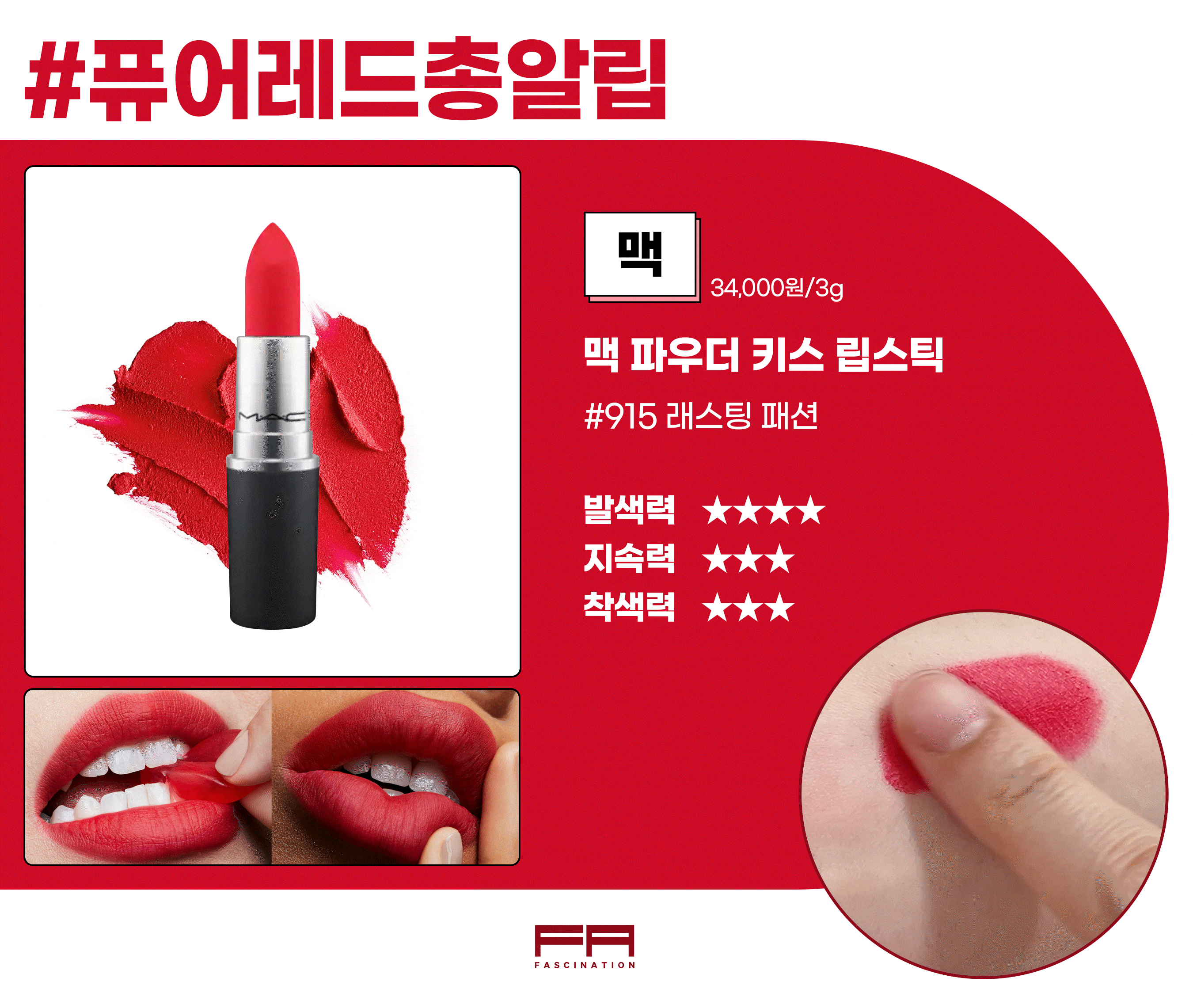 3. 맥 파우더 키스 립스틱 915 래스팅 패션 / 3g / 34,000원