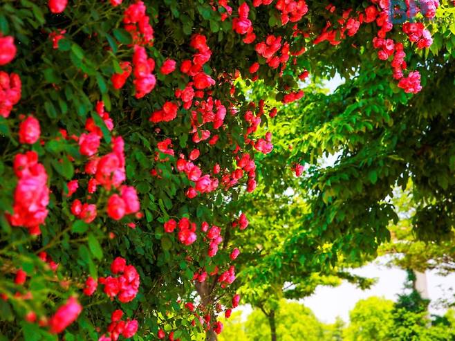무성한 초록 사이로 비집고 올라오는 장미의 색감은 자연이 철저히 설계한 풍경처럼 느껴진다. 사람들의 시선을 끌려 애쓴 장미가 아니라 공원의 결을 따라 자연스럽게 흐르는 장미다.