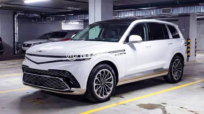 얇고 넓게 펼쳐진 조명 그래픽과 발광형 크레스트 그릴의 조합은 기존 제네시스 SUV보다 한층 미래적인 분위기를 만든다. 여기에 클램쉘 후드와 대구경 휠이 더해질 경우, GV80보다 훨씬 큰 차체 비율이 한층 극적으로 드러날 가능성이 크다.