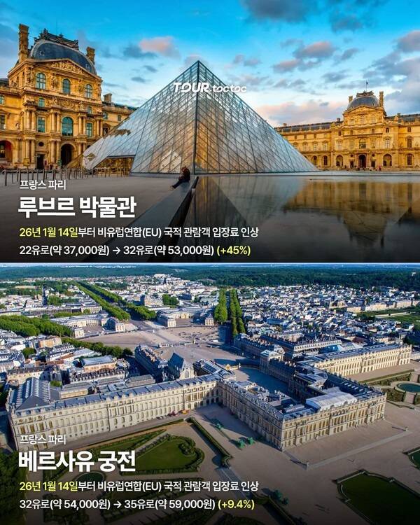 2026년 1월부터 프랑스 파리의 대표 명소 루브르 박물관은 비유럽연합 국적자 대상 입장료를 기존 22유로에서 32유로로 인상합니다.
