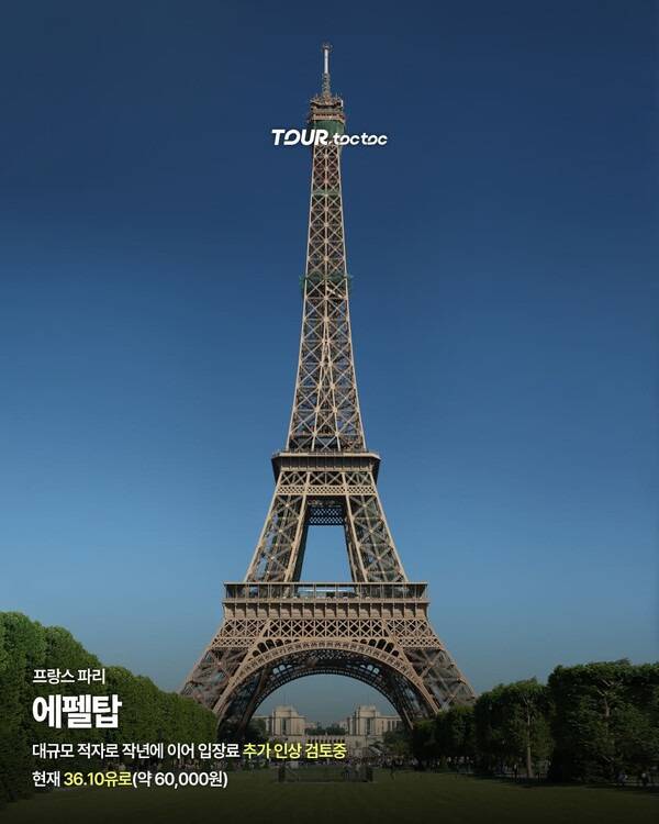 프랑스 파리의 랜드마크인 에펠탑은 현재 36.10유로의 입장료가 적용되고 있으며, 운영 적자로 인해 작년에 이어 추가 인상이 검토되고 있습니다.