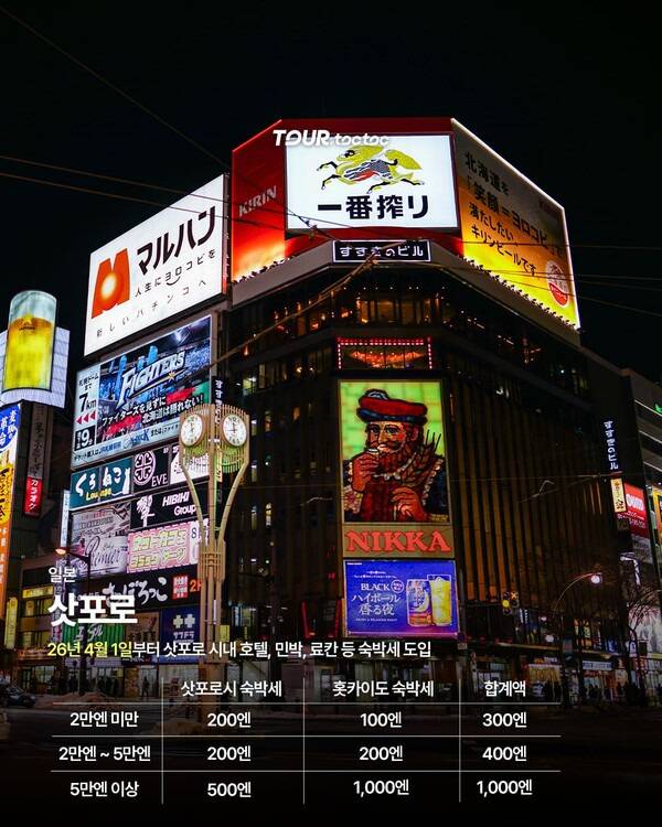삿포로 지역으로 여행을 간 숙박객은 2026년부터 숙박 요금에 따라 차등 숙박세를 납부해야 합니다.