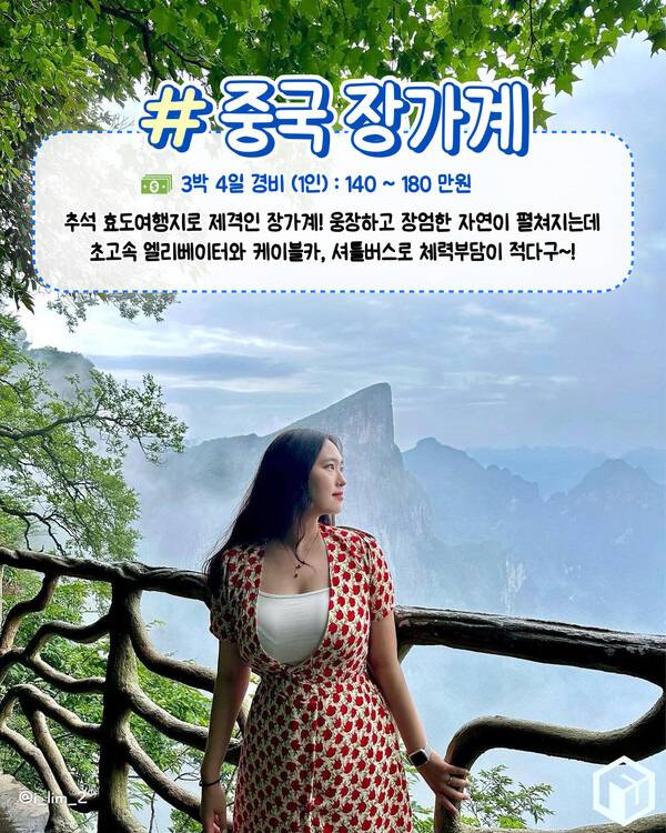 한국과 가까운 중국이라 비행시간도 비교적 짧고 높고 깊은 산세지만 초고석 엘리베이터와 케이블카 그리고 셔틀버스로 체력 부담이 적어 부모님과 함께 하는 추석 효도 여행지로 제격입니다.