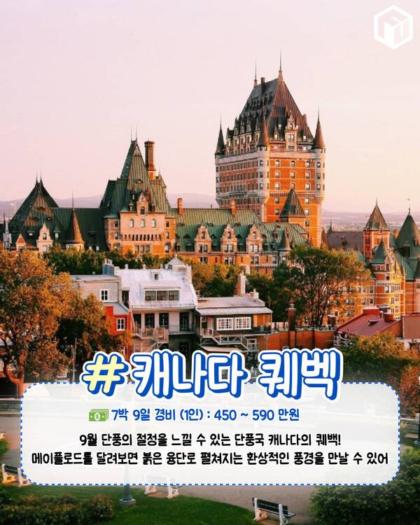 나이아가라 폭포부터 퀘벡시티까지 이르는 단풍 가로수길과 퀘벡주의 몽 트랑 블랑 메이플로드는 캐나다 내에서도 손꼽히는 단풍 명소라고 하는데요. 이런 황홀하고 끝없는 가을을 즐기러 9월 퀘벡으로 떠나보시는 건 어떠신가요?