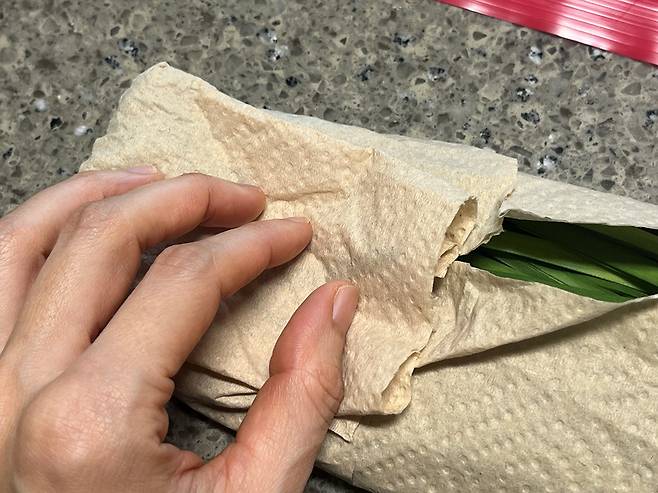 만약 부추가 너무 길어 한 번에 감싸기 힘들다면, 자르지 말고 끝부분을 살짝 접어서 감싸 놓으세요. 부추를 칼로 자르는 순간, 식물의 세포벽이 파괴되면서 그 단면을 통해 수분이 급격히 빠져나갑니다.
