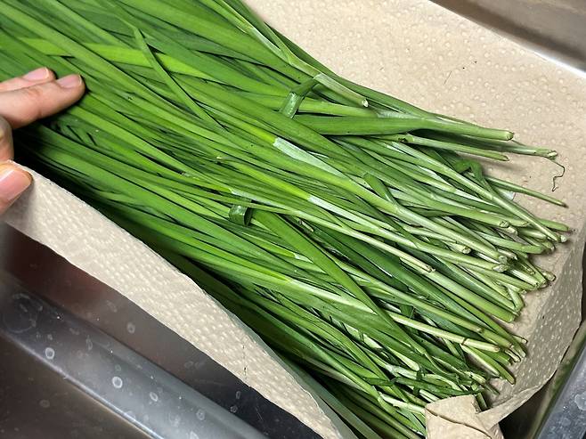 부추에 묻은 흙은 오히려 천연 보호막 역할을 해줍니다. 부추는 그대로 신문지가 키친타월로 돌돌 말아서 감싸세요. 부추를 넓게 펴서 감싸면 종이 재질이 가 미세한 습기를 조절해 줍니다.