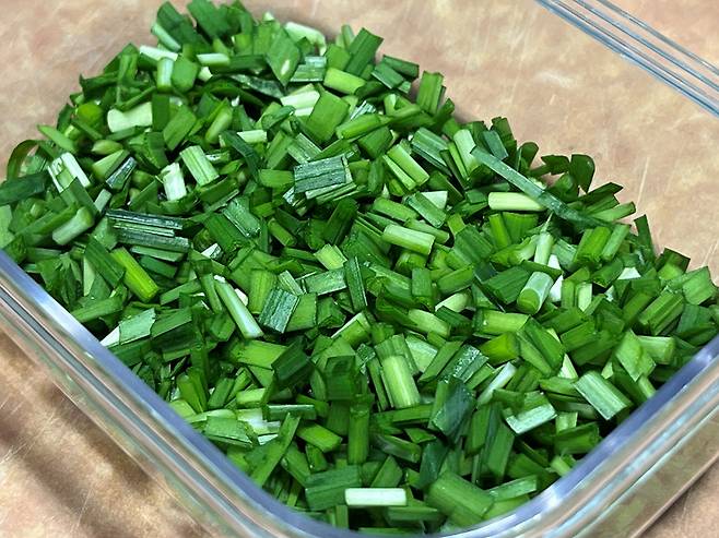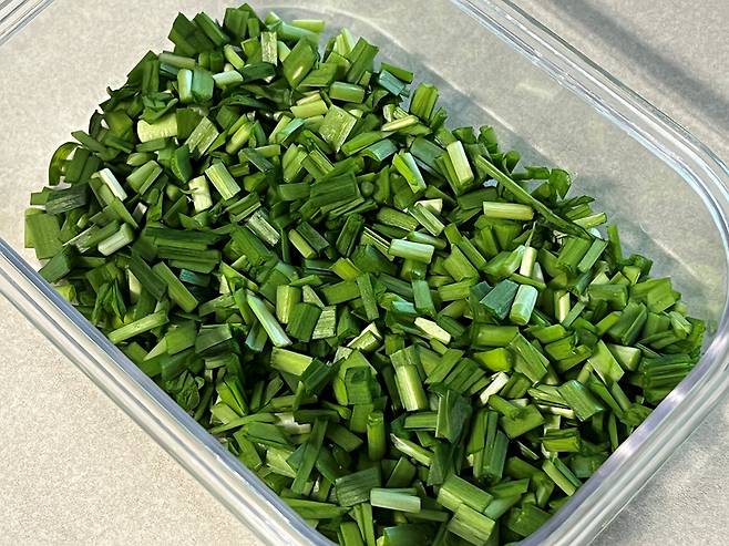 잘게 자른 부추는 밀폐용기 등에 넣은 다음 바로 냉동실에서 얼립니다. 즉시 냉동하는 것은 부추의 맛과 향을 보존하는 가장 좋은 방법입니다.