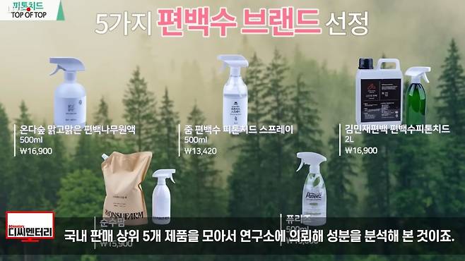 지난 6월 28일 한 유튜버가 재미있는 영상을 업로드했습니다. 국내 최초로 피톤치드 제품들의 제품별 성분함량 비교 영상을 제작한 것인데요. 해당 유튜버는 영상 속에서 대한민국에서 가장 잘나가는 브랜드별 제품들을 모아서 성분함량을 분석한 결과를 공유했습니다. 우리가 모든 제품을 써보지 않아 제대로 알 수 없는 부분이기 때문에 국내 판매 상위 5개 제품을 모아서 연구소에 의뢰해서 성분을 분석해 본 것이죠.