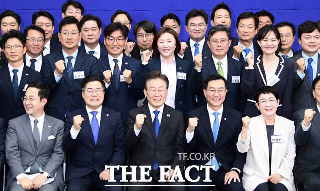 [더팩트ㅣ국회=이새롬 기자] 이재명 더불어민주당 대표(오른쪽)가 16일 오후 서울 여의도 국회에서 열린 초선 당선자 워크숍에 참석해 박찬대 원내대표의 발언을 들으며 웃음짓고 있다.