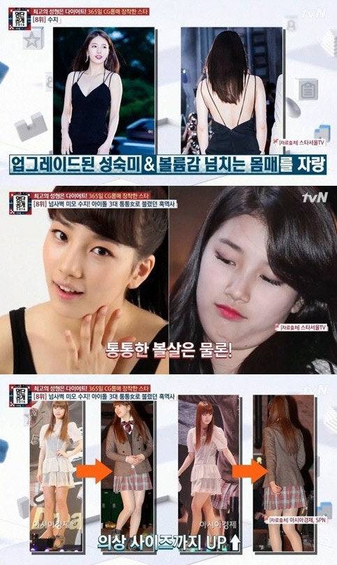 과거 방송된 <명단공개>에서 수지의 다이어트 비법이 공개됐습니다. 수지는 드라마 <드림하이> 출연 당시 첫 드라마라는 부담감과 바쁜 일정으로 체중이 급격히 늘어났습니다. 설리, 강지영과 함께 ‘3대 자이언트 베이비’로 불리기도 했습니다.