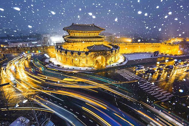 화성의 아름다운 성곽과 전통 건축물들은 낮에도 웅장한 자태를 자랑하지만, 겨울밤의 조명을 받으면 더욱 특별한 매력을 발산합니다.