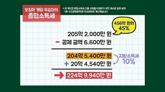 그리고 기타소득은 종합소득에도 포함됩니다. 대략적으로 계산해보면 종합소득세는 10억 원이 넘는 금액에 대해서 45%의 세율이 부과되고, 누적된 공제 금액 약 6,600만 원이 제외되므로 456억의 45%인 약 204억 5,000만 원을 납부해야 합니다. 또 이것의 10%를 지방소득세로 내야 하므로 종합소득세는 약 225억 원이 됩니다.