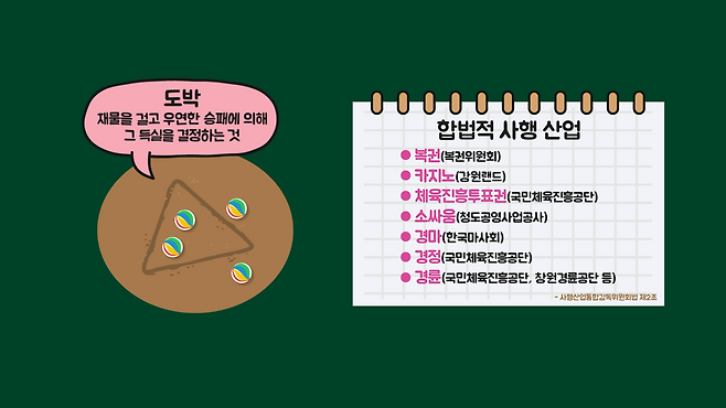 또 도박은 재물을 걸고 우연한 승패에 의해 그 득실을 결정하는 것을 의미하는데, 우리나라에서 합법적으로 허용하는 사행 산업은 아래의 7가지뿐이고, 그 외는 불법 도박에 해당합니다. 참고로 단순 도박은 범죄수익은닉규제법에 적용되지 않아 일반 형법상 몰수·추징의 대상입니다.