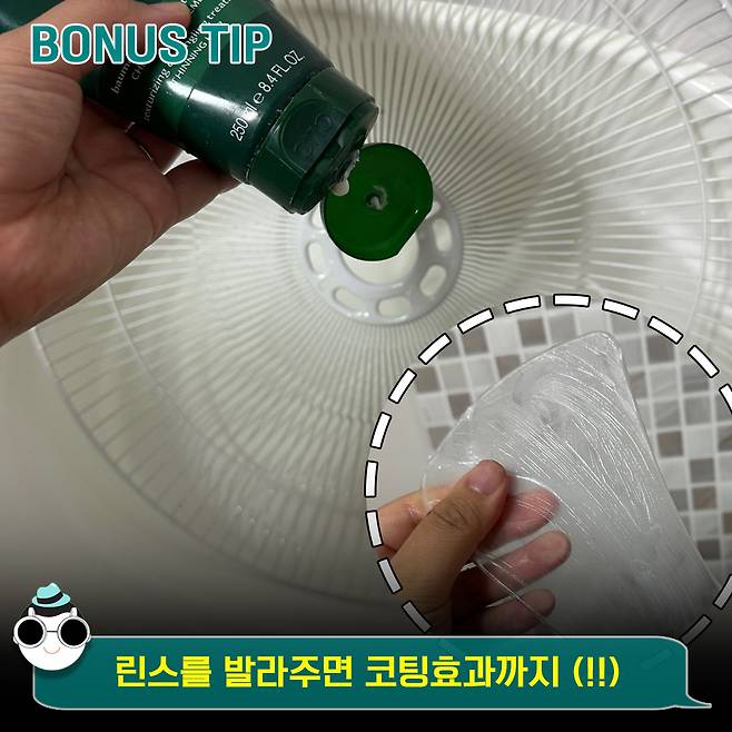 먼지를 제거한 선풍기 날개와 커버에 린스를 발라주세요. 린스의 코팅 효과로 먼지가 한결 덜 쌓이고든요.