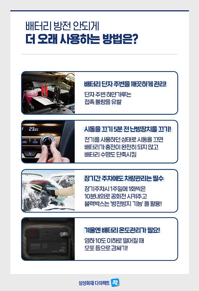 물론 이 방법은 방전이 되었을 때 임시방편으로 할 수 있는 대처 방법입니다. 따라서 시동이 걸렸다면 정비소 등을 찾아가 배터리 상태를 제대로 점검하는 것이 좋습니다.