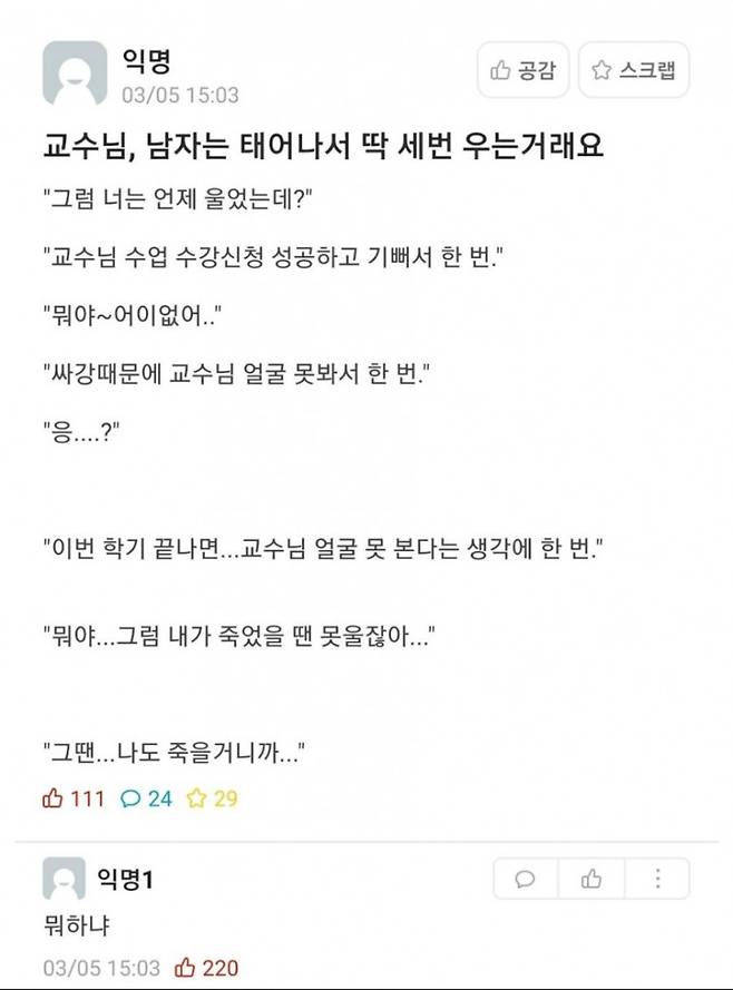 교수님 남자는 태어나서 딱 세번 우는거래요