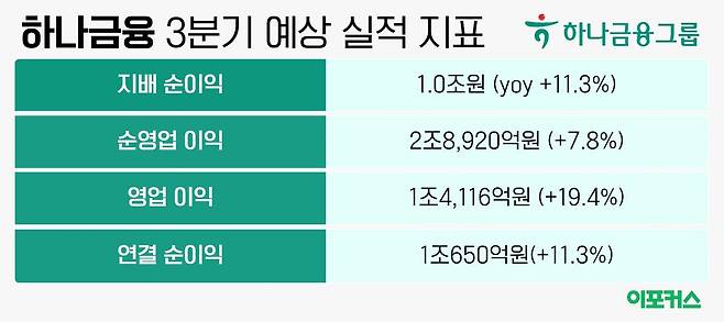 하나금융, 3분기 지배주주순이익 1조원 예상