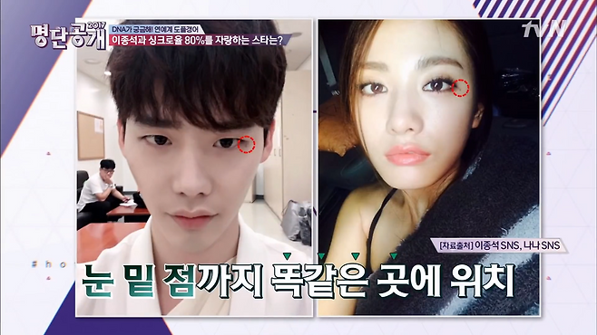 '애프터스쿨'과 '오렌지캬라멜' 출신의 배우 나나와 이종석은 눈썹 모양부터 날카로운 콧대가 닮았는데 3살 차이인 두 사람은 외모뿐만 아니라 눈 밑에 점이 있는 위치부터, 생일과 혈액형까지 동일하다.