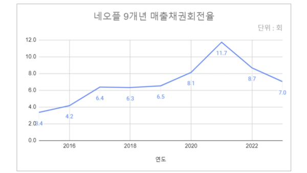 매출채권 회전율은 자산 관리의 효율성을 평가하는 지표 중 하나다. 외상 대금을 얼마나 빨리 현금으로 회수하는 지 나타낸다. 회전율이 높을 수록 매출채권 회수가 빠르고 현금 유동성이 높다는 의미다. 2022년부터 네오플의 유동화 효율성이 조금씩 떨어지고 있다는 의미다.