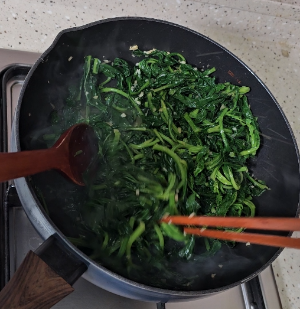 팬에 무친 나물을 넣고 중불에서 가볍게 볶아주세요