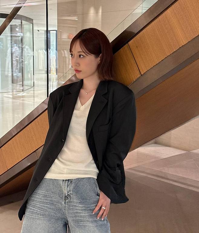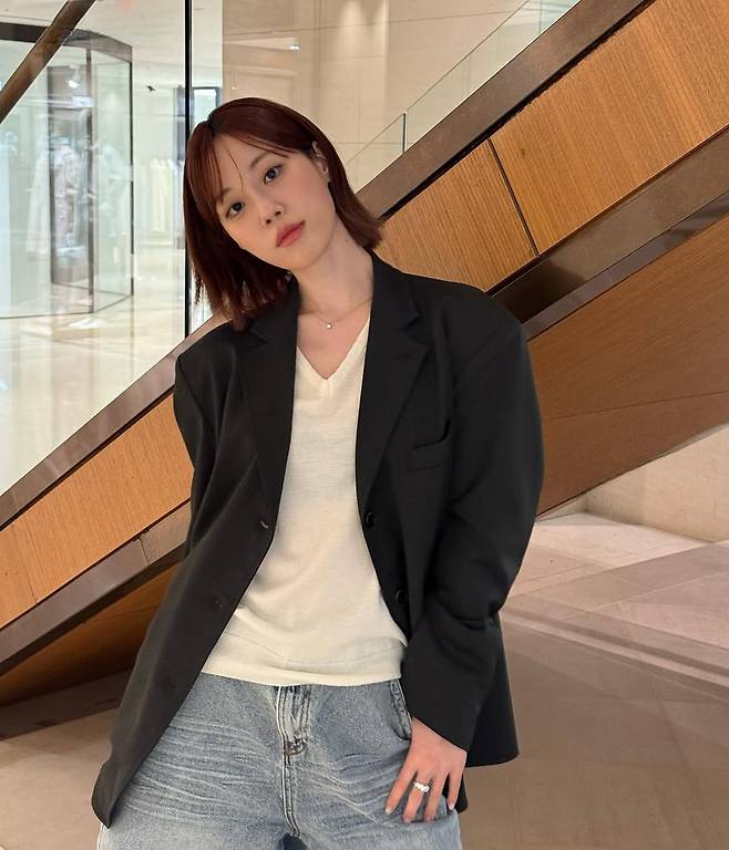 사진 속 허영지는 오버핏 블랙 재킷에 브이넥 화이트 니트를 매치해 부드러움과 날카로움을 동시에 담았다. 재킷은 체형을 따라 자연스럽게 흘렀고, 니트는 은근히 쇄골 라인을 드러내며 여성스러운 분위기를 배가했다. 무심하게 넣은 손끝의 실버 링과도 묘하게 어우러지며 스타일의 균형을 맞췄다.