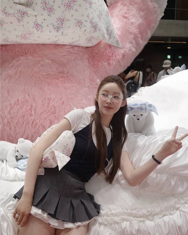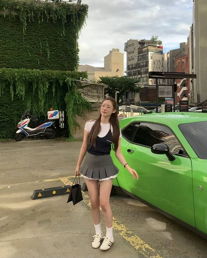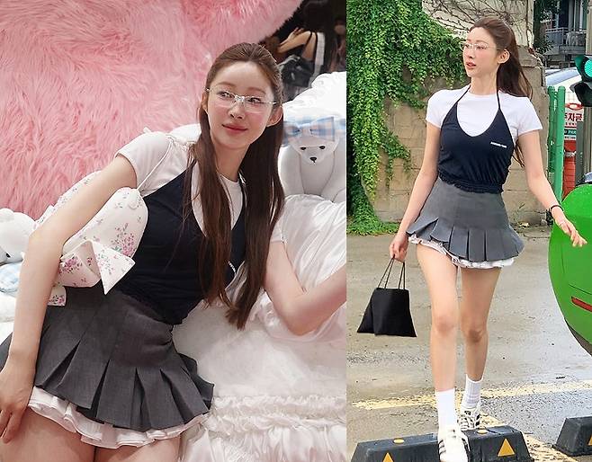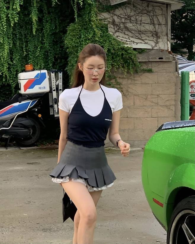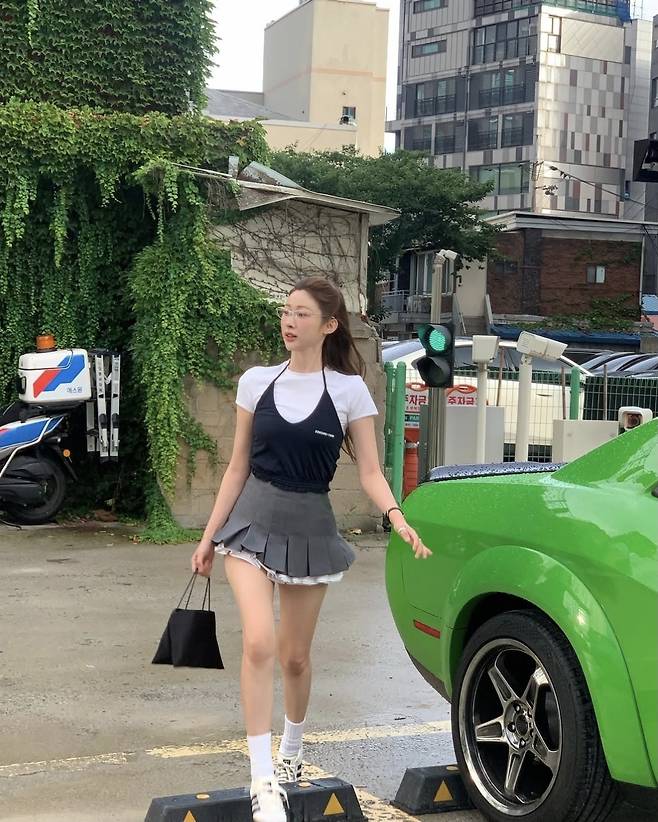차정원은 심플한 화이트 티셔츠에 블랙 슬리브리스 레이어드를 더해 스포티한 무드를 살렸고, 여기에 플리츠 미니스커트로 풋풋한 하이틴 감성을 극대화했습니다.