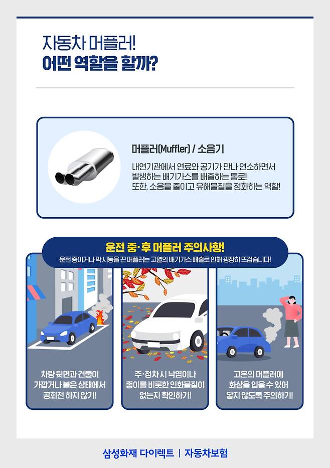 따라서 머플러는 운전 중이나 갓 시동을 멈추고 난 후에는 고열의 상태가 되는데요. 그래서 특히 주의가 필요합니다. 차량 뒷면과 건물이 가깝거나 붙은 상태 또는, 낙엽이나 종이같이 인화물질이 있는 곳에선 화재의 위험이 있어 주·정차나 공회전을 하지 않아야 합니다.