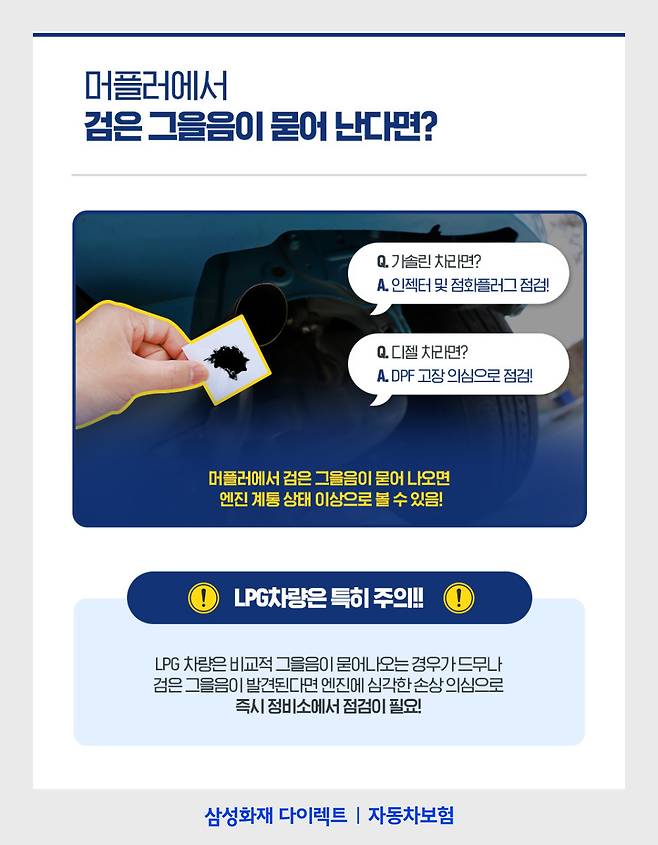 만약 LPG 차량이라면 특히 주의하여 점검할 필요가 있는데요. 보통 LPG차량은 그을음이 묻어나오는 경우가 적기 때문입니다. 만약 검은 그을음이 발견되면 엔진에 심각한 손상이 발생했음을 의심할 수 있으니, 확인되는 즉시 정비소에서 점검해보는 것이 좋습니다.