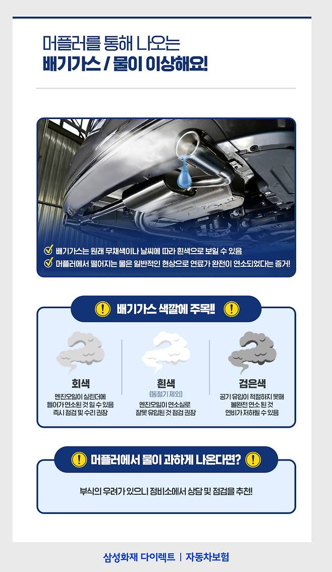 또 머플러에서는 물이 뚝뚝 떨어지는 것을 쉽게 볼 수 있는데요. 이는 연소가 잘되고 있다는 증거로 볼 수 있습니다. 하지만 물이 평소보다 과하게 나오는 것 같다면 차량하부 부식 우려가 있습니다. 이상증세가 확인된다면 꼭 정비소에서 상담 및 점검을 받는 것을 권합니다.