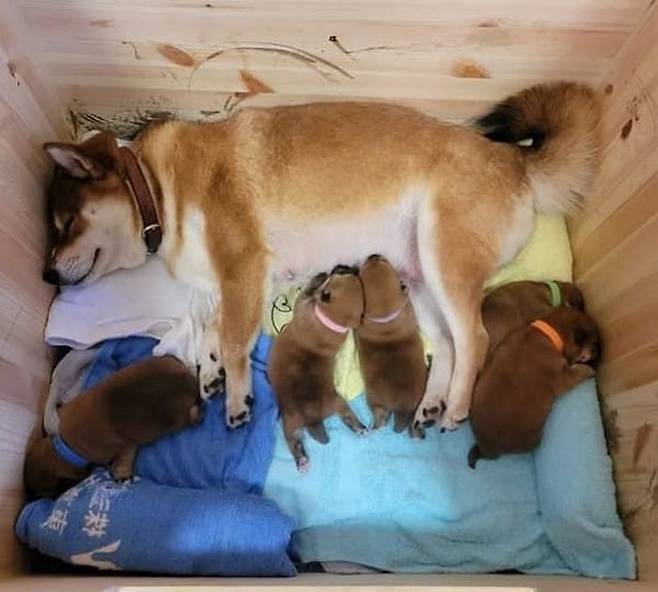 처음 아빠가 된 순간이다보니 새끼들의 귀엽고 사랑스러운 모습을 눈에 오랫동안 다 담으려고 보고 또 보는 아빠 강아지.