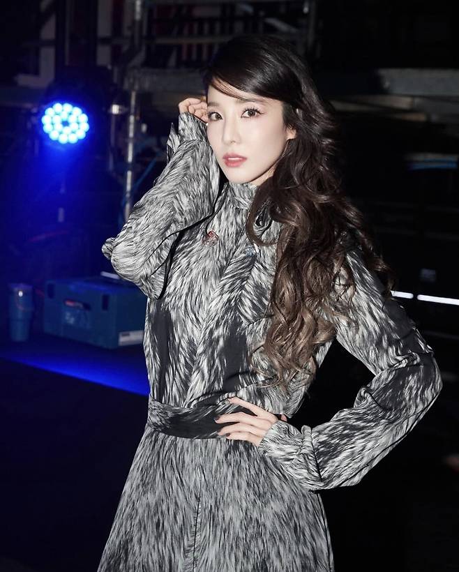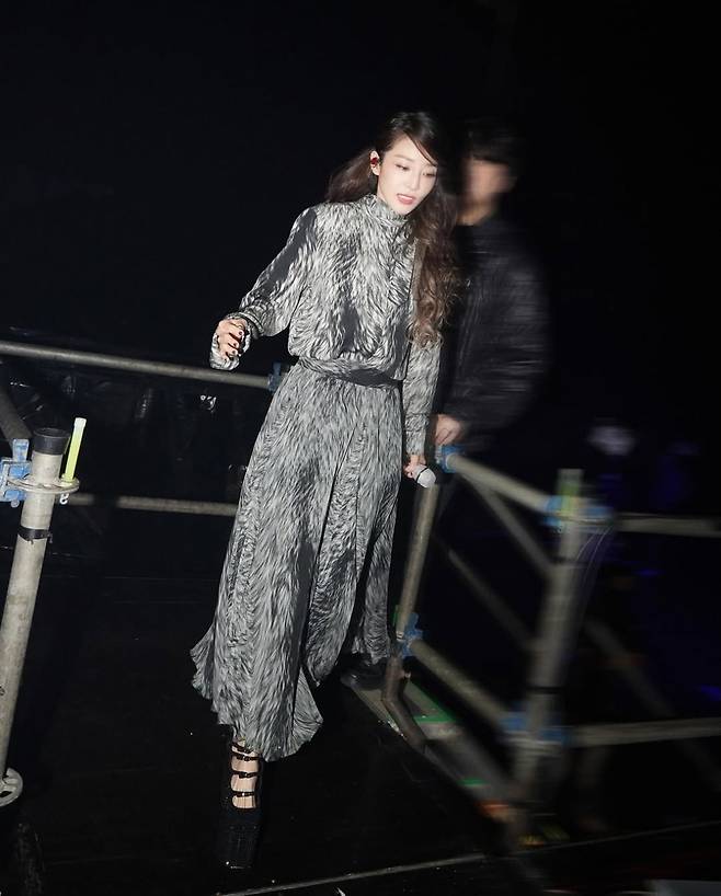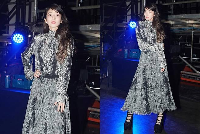 산다라박은 마치 그림 같은 무대 위에서 블랙과 그레이가 어우러진 독특한 패턴의 롱 드레스를 입고 등장했다.