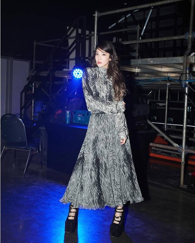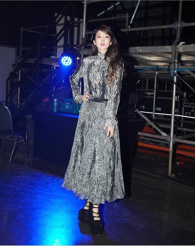 특히 하늘하늘한 실루엣과 우아한 하이넥 디자인이 세련된 분위기를 더욱 강조했으며, 블링블링한 플랫폼 슈즈로 키 포인트를 더해 감각적인 스타일링을 완성했다.