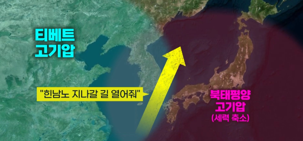 중국 쪽에 있는 티베트 고기압이 세력을 그대로 유지하고, 일본 쪽 북태평양 고기압은 세력이 축소되면서 힌남노가 지나갈 길을 열어줬고, 인도양과 남중국해 수증기도 힌남노의 세력을 유지하도록 돕기 때문입니다.