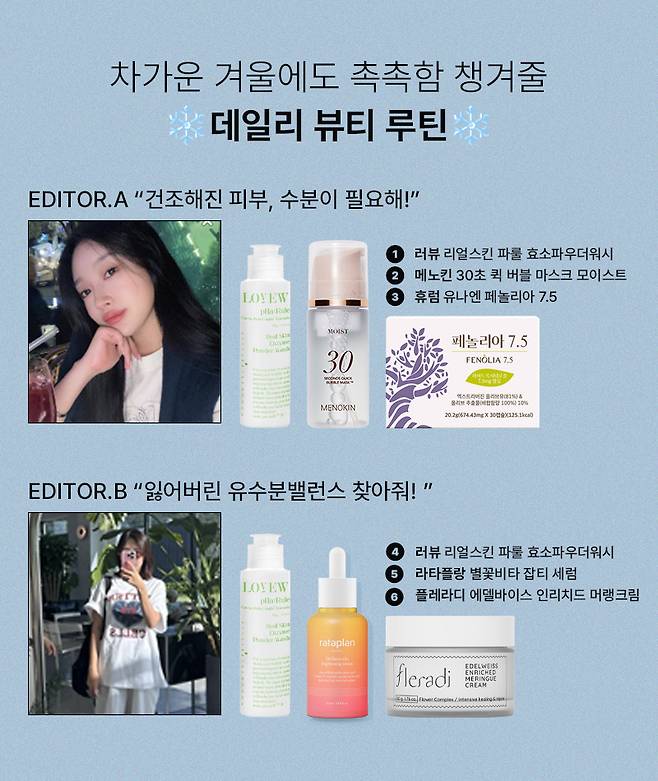 오늘은 한 건성, 한 민감한 피부 하는 에디터 A와 에디터 B의 겨울철 물광 피부의 비밀 병기를 공개했다.