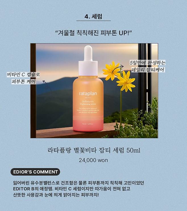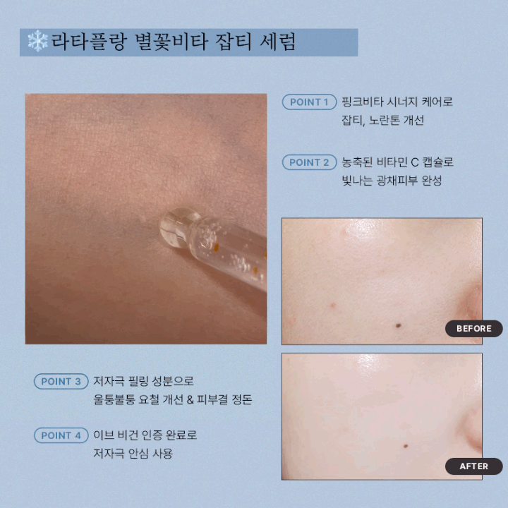 라타플랑 별꽃비타 잡티 세럼을 사용하면서 잡티 케어는 물론이고, 칙칙하고 노란빛이었던 피부가 깨끗하고 투명한 피부 톤으로 개선되었다. 에디터가 꾸준히 사용하고 있는 제품!