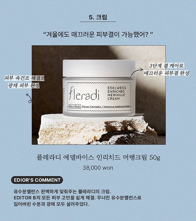 초겨울 스킨케어의 마무리는 역시 크림.에디터 B의 무너진 유수분 밸런스 잡아주는 데 역할을 톡톡히 한 제품으로, 피부 겉만이 아닌 속 건조를 해결해 주는 데 탁월한 제품이다.