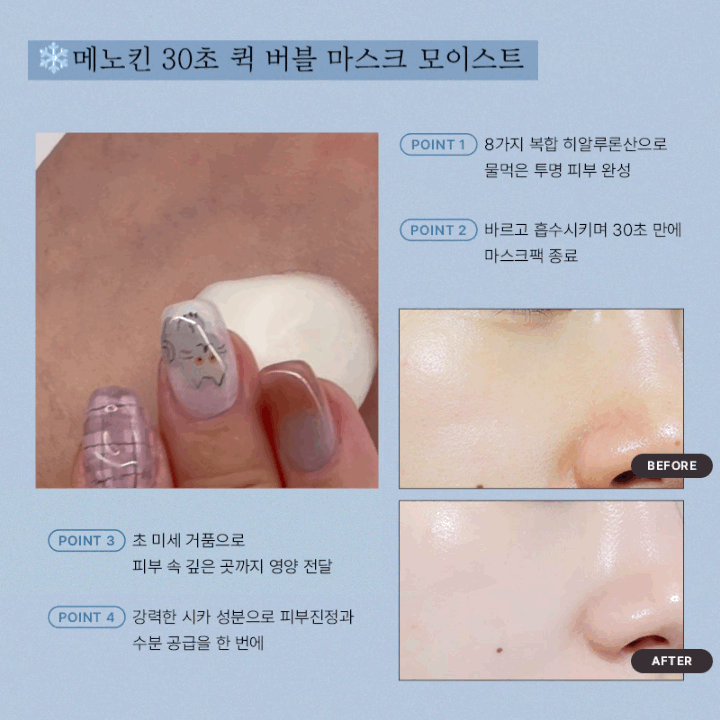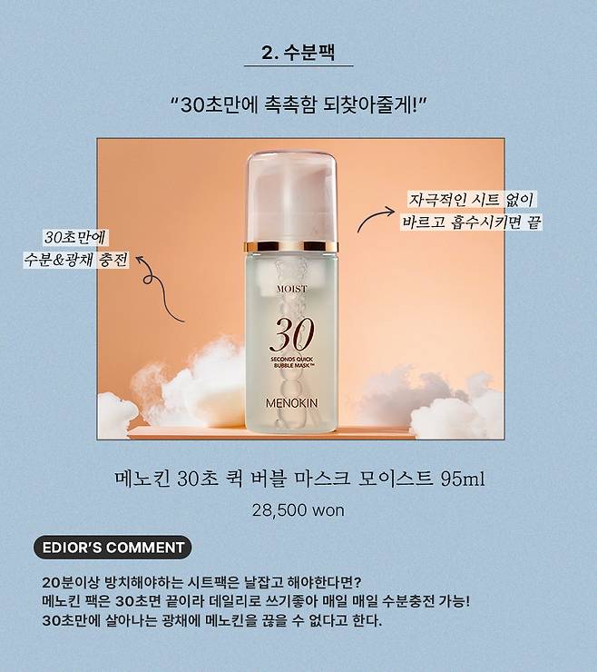 에디터 A의 애장템인 메노킨 30초 퀵 버블마스크 모이스트는 건성피부라면 필수로 사용해야 할 화장품.