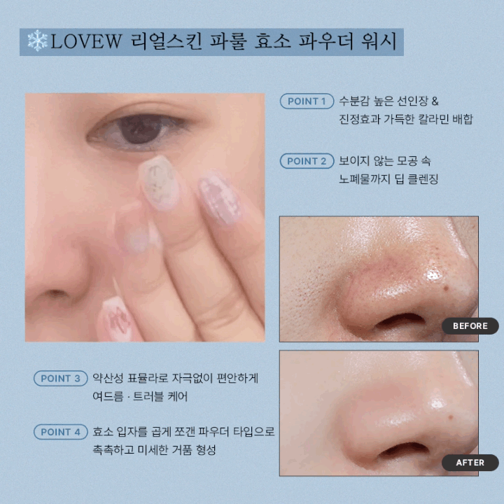 세안 후 묵은 노폐물과 각질로 문제를 일으켰던 여드름, 뾰루지 등이 사라지고,푸석푸석하고 각질 때문에 거칠었던 피부 결을 매끄러운 피부로 재탄생 해준다.