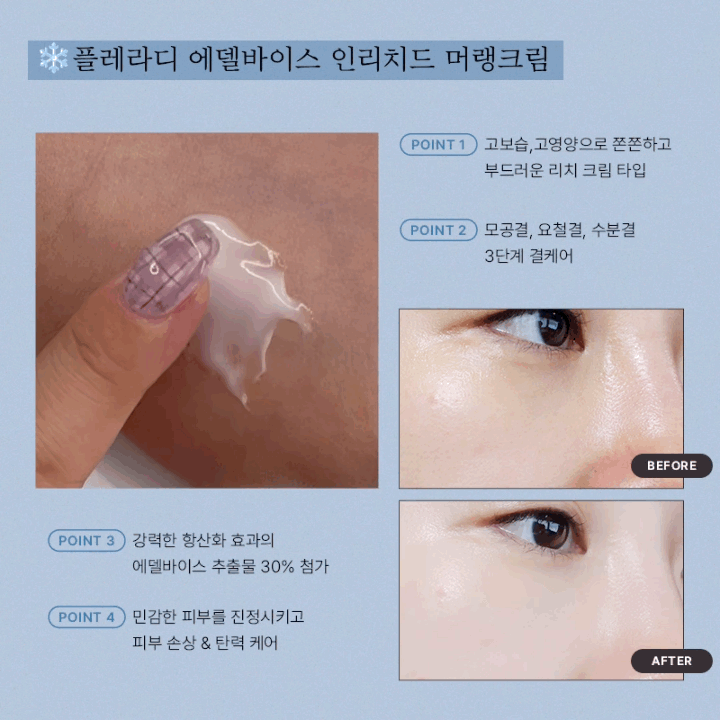 제품명처럼 아주 뽀얀 머랭 크림을 연상케하는 크리미한 제형으로, 가벼우면서도 쫀쫀한 텍스처를 자랑한다. 속 건조를 확실하게 잡아주기 때문에 아침, 저녁 구분 없이 열심히 바르는 제품.