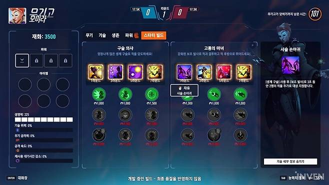 먼저 7라운드 단판으로 진행한 시연이었기 때문에 기자가 한 모이라를 기준으로 설명할 수밖에 없는 점은 이해바란다. 대략적으로 확인해 본 바 무기고에서 캐릭터를 성장하는 형태는 두 가지로 구분됐다. 모이라의 경우 '구슬 의사'와 '고통의 마녀'로 간단히 말하자면 힐러로서의 역할에 충실할지 아니면 딜러로서의 역할에 충실할지 선택할 수 있도록 한 셈이다.