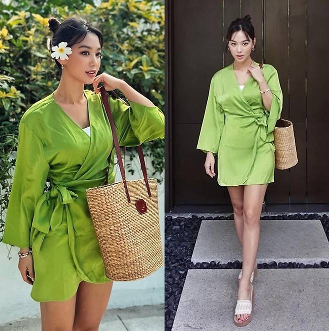 공개한 사진에서 김희정은 늘씬한 각선미가 드러난 하의실종 스타일의 벨티드 랩 가운 리조트룩으로 남다른 비율을 자랑했다.